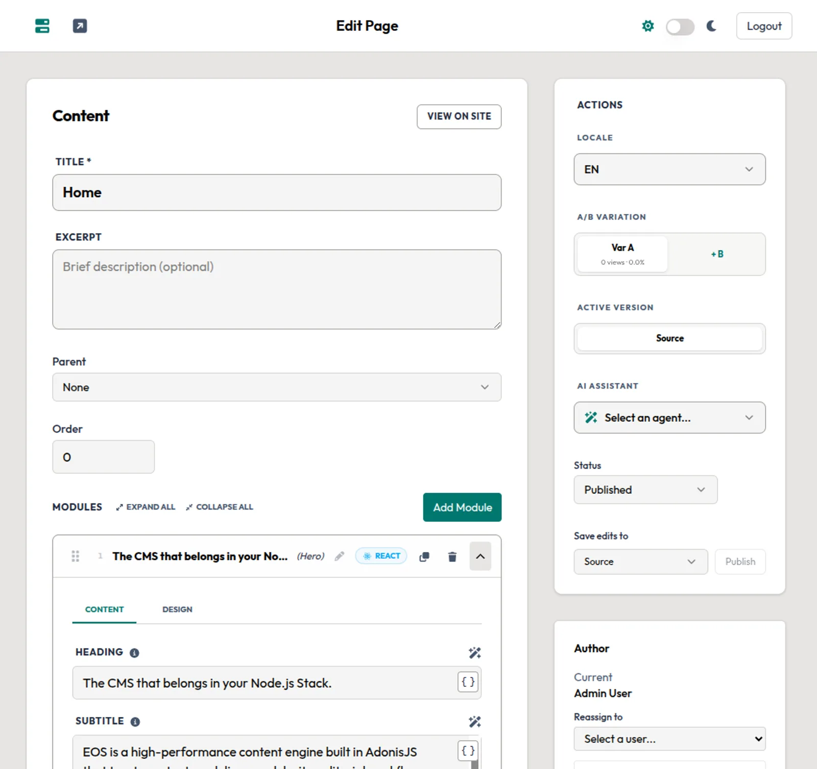 EOS is a high-performance content engine built in AdonisJS that treats content modeling, modularity, editorial workflow and AI orchestration as code-first concerns. It delivers the agility of a page builder with the power of your native Node.js stack.